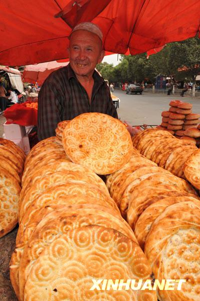 7月12日,在新疆伊宁市汉人街巴扎上,一名老者正在卖馕。新华社记者 才扬摄