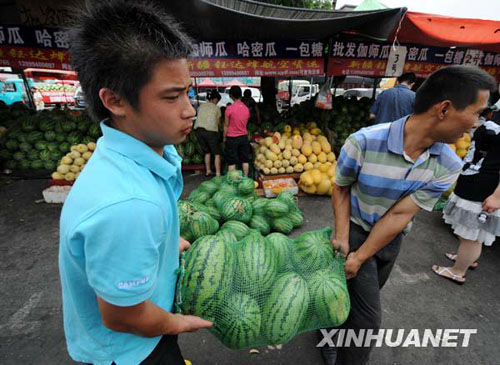 7月13日,客商在乌鲁木齐北园春农产品中心批发市场搬运西瓜。