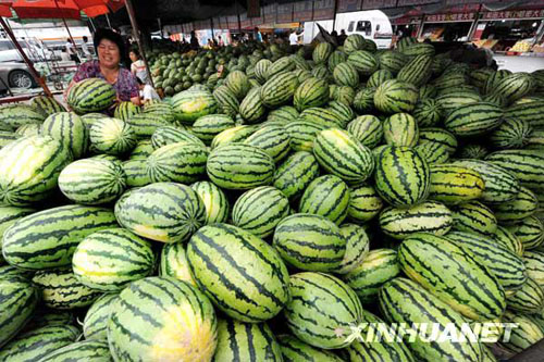乌鲁木齐北园春农产品中心批发市场内,刚从石河子运到的西瓜堆成小山(7月13日摄)。来自石河子等地的北疆西瓜,批发价为每公斤0.7元左右,零售价为每公斤1元左右。新华社记者李紫恒摄