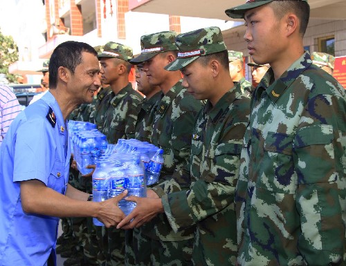 7月14日,新疆喀什疏勒县工商行政管理局干部(左一)向执勤的武警官兵送上饮用水。当日,新疆喀什疏勒县工商行政管理局员工和疏勒县私营个体协会会员慰问执勤的武警官兵,为他们送去饮用水、西瓜等慰问品。 新华社记者 李明放 摄