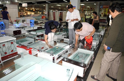 7月14日,几名顾客在乌鲁木齐市华凌贸易城挑选家具。堪称新疆最大“巴扎”的华凌贸易城在乌鲁木齐“7·5”事件后没有一天歇业,来自全国各地的6000多名商户从容地吆喝着生意。“巴扎”在维吾尔语中是集贸市场之意,华凌贸易城位于乌鲁木齐市中心。新华社记者 王菲 摄
