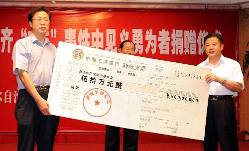 7月16日,国投新疆罗布泊钾盐有限责任公司总经理李浩(右)代表公司向“新疆社会治安综合治理见义勇为基金会”捐款50万元。当日,新疆社会各界为在乌鲁木齐“7·5”事件中见义勇为的群众踊跃捐款。新华社记者 沙达提 摄