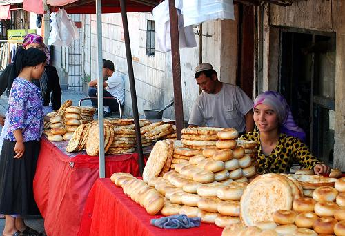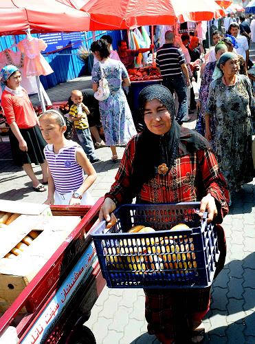 7月18日,维吾尔族妇女在乌鲁木齐市山西巷布匹巴扎购买布料。新华社记者 沙达提摄