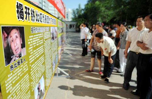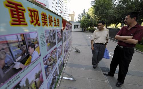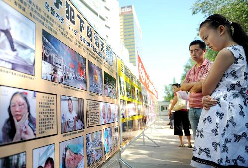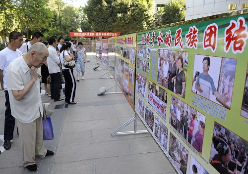 7月21日,市民在乌鲁木齐市图书馆前观看图片展。当日,由乌鲁木齐市委宣传部、文化局主办的新疆维吾尔自治区乌鲁木齐市打砸抢烧严重暴力犯罪事件纪实图片展在乌鲁木齐市图书馆前展出,300余幅图片真实地再现了乌鲁木齐“7·5”事件发生、处置、善后全过程。从22日起,该图片展还将进入部队、社区、学校、乡镇等地巡展。新华社记者王菲 摄