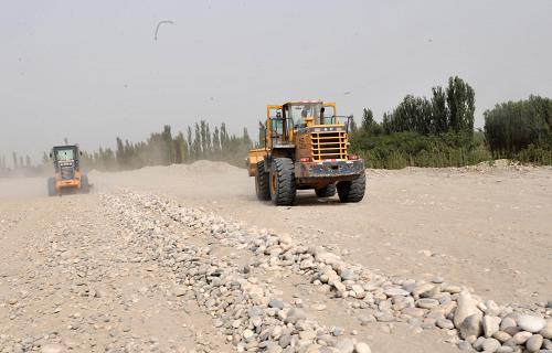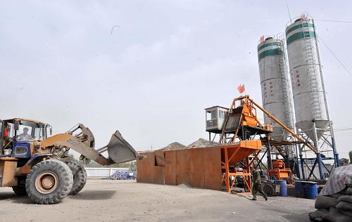 7月21日,在新疆和田火车站施工现场,工人驾驶铲车,将原料倒入混凝土搅拌机内。在建设中的喀(什)和(田)铁路正线全长487公里,项目投资估算总额46.4亿元,预计于2010年建成通车。届时,“和谐号”动车组将运行于塔克拉玛干沙漠南缘,加速南疆三地州(喀什地区、和田地区、克孜勒苏柯尔克孜自治州)的经济社会发展。新华社记者 金良快 摄
