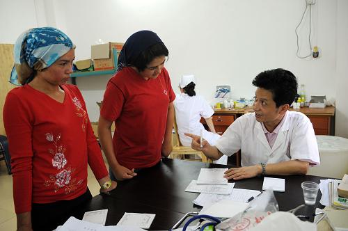 7月22日,韶关市曲江区中医院医生杜鸣(右)在韶关旭日玩具厂医务室为新疆籍员工看病。新华社记者 刘大伟 摄