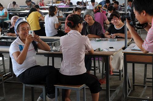 7月22日,在韶关旭日玩具厂务工的一名新疆籍员工(前左)拿起手机与正在采访的记者对拍起来。目前在韶关旭日玩具厂工作的新疆籍员工有755人,7月以来,员工总数一直保持稳定。韶关市委副书记林耀明表示:“我们不会让一次偶然发生的治安事件影响到韶关和新疆的经贸合作和务工交流。未来我们将进一步采取措施,妥善安置新疆籍员工在韶关的务工、生活,让他们在韶关长期安心就业。”新疆劳务输出先进县——喀什地区疏附县负责人也表示:“经过广东和新疆两方面的共同努力,在韶关安心地长期就业,已是这里700多名新疆少数民族外出务工人员的共同心声”。由于近日广东天气炎热、气候潮湿,有个别新疆籍员工感到不适应而离开韶关返回家乡。旭日玩具厂负责人说,尽管采取了一系列防暑降温措施,但由于两地气候环境差异大,还是有一些新疆籍员工感冒、中暑。“他们回新疆避暑,我们是理解的。欢迎他们在暑期过后继续回来工作。”这位负责人说。 新华社记者 刘大伟 摄