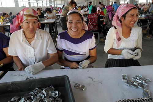 7月22日,在韶关旭日玩具厂务工的新疆籍员工努尔古丽·麦麦提玉苏甫(左)和热孜凡尼古丽·麦麦提玉苏甫(中)姐妹俩在生产线上工作。新华社记者 刘大伟 摄