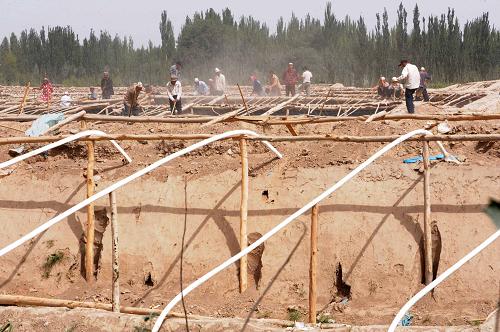7月23日,由各村组抽调的义务工在恰热克乡450亩大棚示范区维修棚架。新疆喀什地区莎车县现有2.78万亩蔬菜大棚,今年小麦丰收后,乡政府在农闲时间组织农民投入到蔬菜大棚的维修和建设工作中,为冬季反季节蔬菜的种植增收打好基础。新华社记者 周文杰 摄