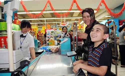 7月23日,市民在家乐福乌鲁木齐大巴扎店购物。当日,自乌鲁木齐“7·5”事件后闭店17天的家乐福乌鲁木齐大巴扎店重新开门营业。新华社记者 沙达提 摄