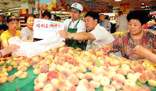 7月23日,顾客在家乐福乌鲁木齐大巴扎店挑选蟠桃。新华社记者 沙达提 摄