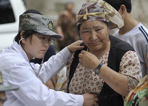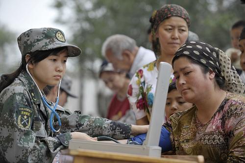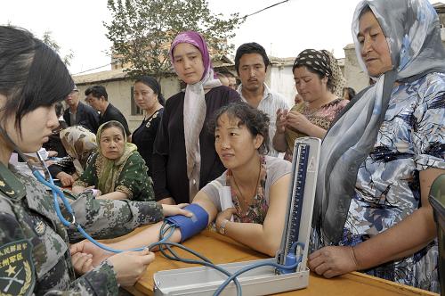 7月23日,解放军第二十三医院医务人员为乌鲁木齐八户梁社区一位居民量血压。当日,解放军第二十三医院医务人员来到乌鲁木齐八户梁社区开展义诊活动,社区内上百位各族居民前来问诊,军医们还为当地赠送了一些常用药品。新华社记者 赵戈 摄