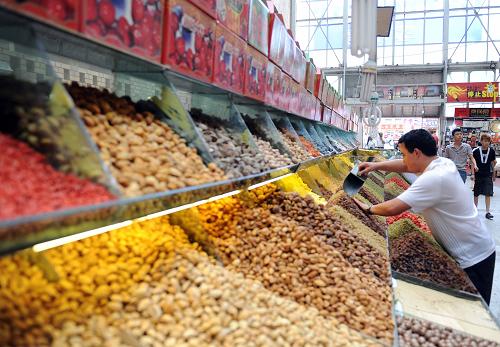 7月26日,一名商贩在乌鲁木齐国际大巴扎整理干果。新华社记者 沙达提 摄