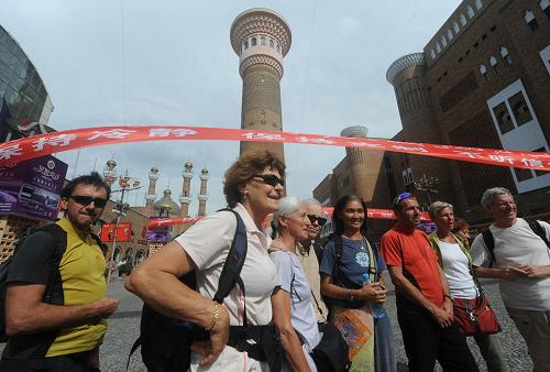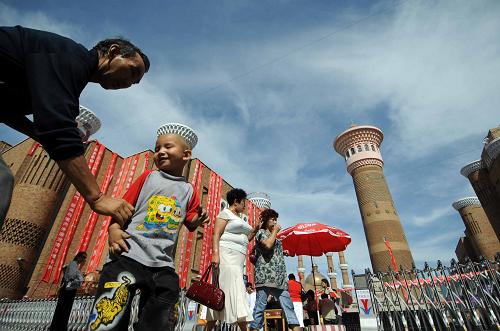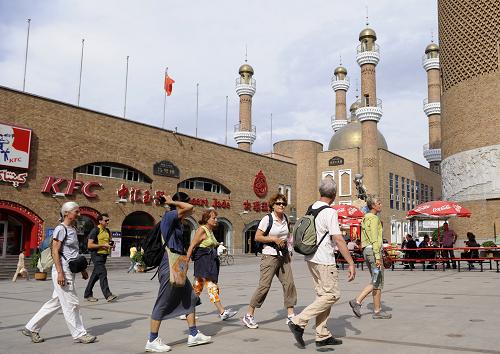 来自法国的游客在逛乌鲁木齐国际大巴扎(7月23日摄)。 新华社记者 戴旭明 摄