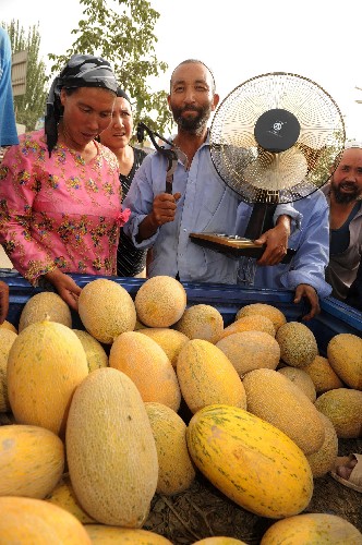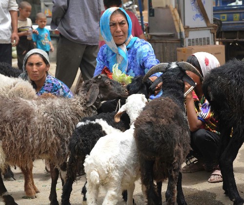 7月25日,几名农村妇女在喀什国际大巴扎上销售自家喂养的羊。在南疆的喀什、阿克陶、莎车和叶城等地,一到维吾尔族群众的巴扎(赶集)日,人们纷纷来到设在城市周边的巴扎上交易,形成了喀什国际大巴扎、叶城新世纪农贸市场、阿克陶县中心农贸市场等一批每天人流量达5万以上的超级大巴扎。新华社记者 周文杰 摄
