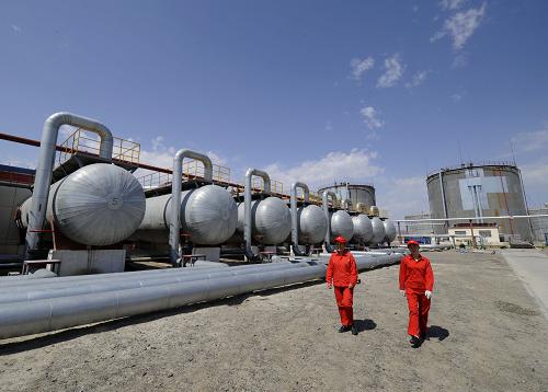 7月28日,两位石油工人从新疆油田采油二厂81号原油处理站储油罐前经过。据新疆油田公司介绍,2009年1月1日至7月28日,新疆油田公司动用钻机81台,钻井总进尺超过50万米,累计产原油590.6万吨,产天然气20.6亿立方米,油气当量达到754.8万吨。新华社记者 赵戈 摄