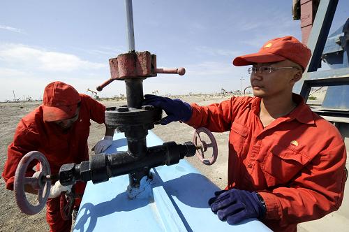 7月28日,石油工人在对新疆油田一处抽油机进行检查。新华社记者 赵戈摄