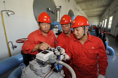 7月28日,石油工人在新疆油田采油二厂81号原油处理站分离器操作间检查设备。新华社记者 赵戈 摄
