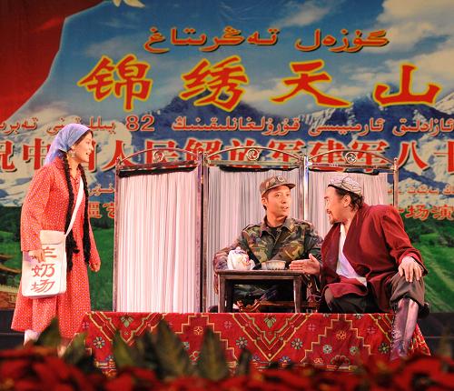 7月29日,新疆艺术剧院话剧团演员在表演小品《保险》。当晚,由新疆维吾尔自治区文化厅主办的《锦绣天山》庆祝八一建军节,慰问武警、公安干警文艺晚会在新疆艺术剧院上演,精彩的文艺表演赢得在场官兵的热烈掌声。 新华社记者 沙达提 摄