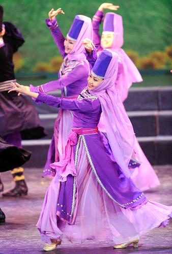 7月29日,新疆艺术剧院歌舞团演员在表演舞蹈《天山脚下是我的家乡》。新华社记者 沙达提 摄