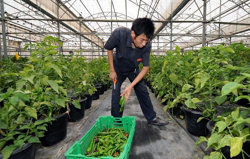 克拉玛依曾林科技生态园的职工在采摘“螺丝椒”(7月29日摄)。戈壁油城新疆克拉玛依引进滴灌种植等技术和先进设备,积极发展绿色种植业,生产出的彩椒、黄瓜和金瓜等绿色蔬菜受到顾客欢迎。新华社记者 赵戈 摄