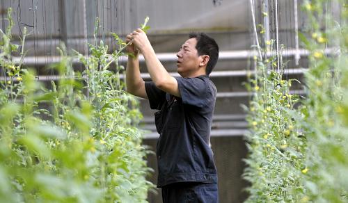 克拉玛依曾林科技生态园的职工在察看无土栽培黄瓜的长势(7月29日摄)。 新华社记者 赵戈 摄