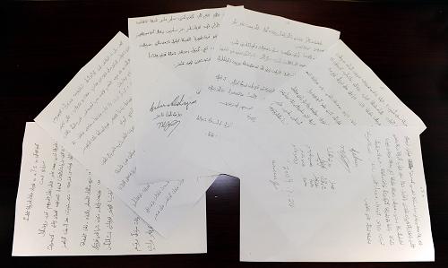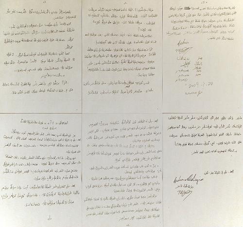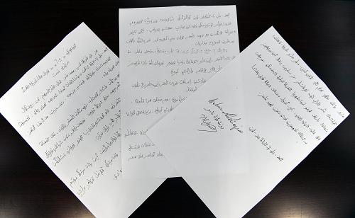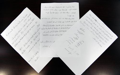 这是热比娅境内亲属分别致热比娅和乌鲁木齐“7·5”事件遇难者家属的信件(8月2日摄)。热比娅在境内的亲属--儿子卡哈尔、女儿茹仙古丽和弟弟买买提等,近日分别致信热比娅和乌鲁木齐“7·5”事件遇害者家属,对热比娅违背了自己的誓言参与分裂活动表示不满,对暴力事件表示气愤,对无辜死亡的群众和他们的家属表示歉意。新华社记者 丁林 摄