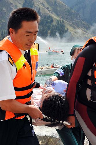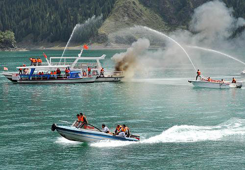 8月4日,救援船只在演习中灭火并转移“游客”。当日,新疆最大规模的水上安全应急演习在天山天池举行。演习模拟两艘游船相撞引发起火,有数名游客落水。救援部门接到报警后,迅速出动船只,展开水上搜救。共有近百名相关人员参与演习,出动各类船艇10艘。 新华社发(江文耀 摄)
