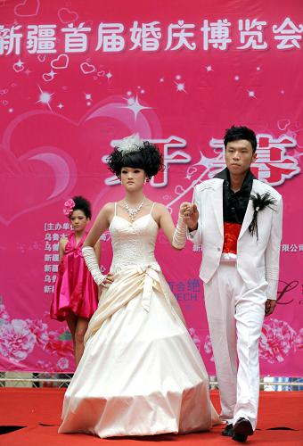 8月6日,模特在婚庆博览会上展示婚礼服装。当日,新疆首届婚庆博览会在乌鲁木齐市新疆国际博览中心开幕。婚庆博览会分为婚纱、摄影精品、结婚首饰精品、婚庆服务、喜宴用品、新婚家居精品、家用汽车等8个展区。 新华社发(江文耀 摄)