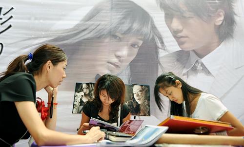 8月6日,一名参展人员(左)在婚庆博览会上向顾客介绍婚纱摄影。 新华社发(江文耀 摄)