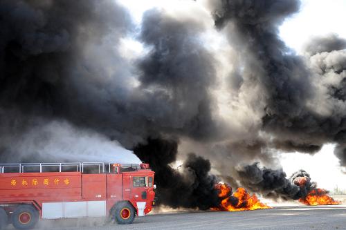 8月6日,一辆消防车在演习现场灭火。当日,新疆喀什地区应急办和喀什机场等单位联合举办机场处突应急救援综合演习。演习旨在检验公安、武警和卫生等部门在突发状况下的协同配合能力。 新华社记者 周文杰 摄