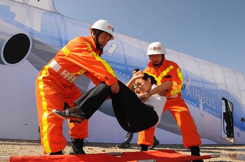 8月6日,一名“伤员”被救援人员抬下飞机。 新华社记者 周文杰 摄