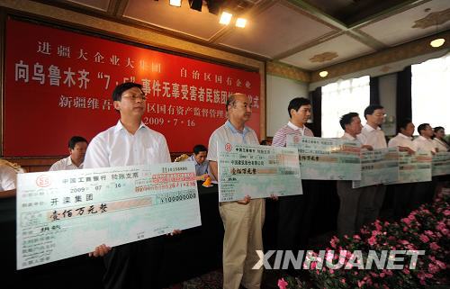 16日,神华集团、中粮集团、宝钢集团等33家中央及外省(区、市)驻疆国有企业和中泰化学、中国移动新疆公司、新疆有色集团等33家自治区国有企业的代表齐聚乌鲁木齐昆仑宾馆,向“7·5”事件受害者和财产受损失的群众捐款。其中,神华集团捐款5050万元,中粮集团捐款2000万元,宝钢集团、中国保利集团、国家电网公司和国家开发投资公司等6家中央驻疆国有企业捐款在1000万元以上。