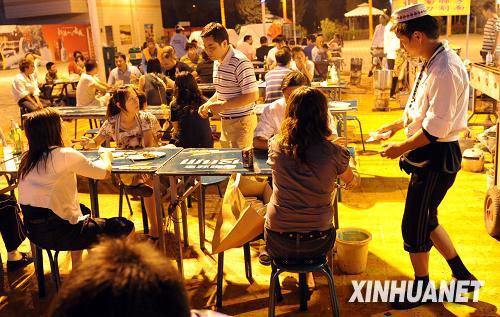 7月18日22时许,人们在乌鲁木齐南湖露天夜市品尝特色小吃。盛夏之夜的新疆乌鲁木齐十分热闹,众多市民和游客在露天夜市品尝各类特色小吃。新华社记者 沙达提 摄