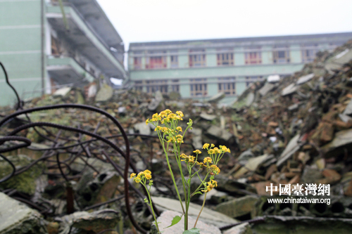 在地震遗址,处处都可见到这样的黄色小花在废墟上顽强地生长着。(中国台湾网 田云鹏 摄)