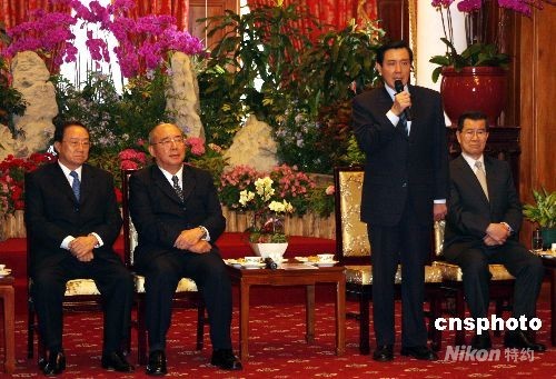 5月24日上午,马英九、萧万长在台北宾馆与将于26日前往大陆访问的中国国民党主席吴伯雄一行茶叙,为其饯行。 中新社发 陈立宇 摄