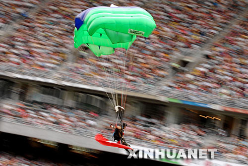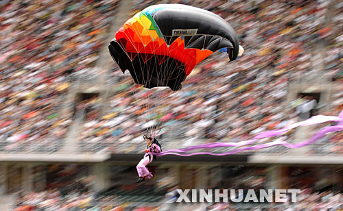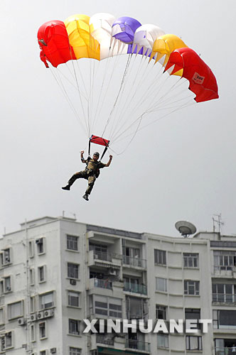 7月2日,解放军八一跳伞队队员在表演。当日,“雄鹰翱翔庆回归”――解放军八一跳伞队表演在香港大球场举行。新华社记者 吕小炜摄