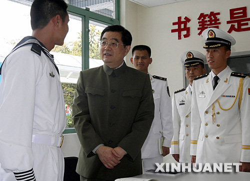 检阅结束后,胡锦涛视察了舰艇大队警通连阅览室、电脑室,并走进连队宿舍,同战士们一一握手,围坐在一起亲切交谈,仔细询问大家的值勤、训练、学习和生活情况。