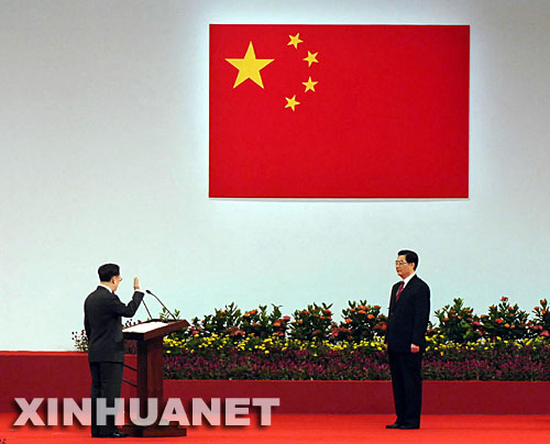 7月1日,庆祝香港回归祖国十周年大会暨香港特别行政区第三届政府就职典礼在香港会展中心举行。这是香港特区第三任行政长官曾荫权面对胡锦涛主席,举起右手庄严宣誓。 新华社记者公磊摄