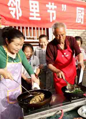 5月21日,社区各族居民在邻里节厨艺展示现场制作菜肴。当日,哈密市前进西路社区“构建和谐邻里共建美好家园”社区邻里节开幕。此次活动旨在通过厨艺展示、文艺演出和群众性趣味游戏等形式增进邻里关系,促进和谐社会建设。