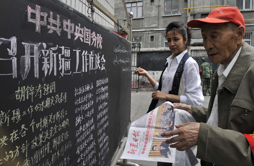 5月21日,居民吴子英和社区干部在出板报。乌鲁木齐市新华南路街道办事处五桥社区居民吴子英说:“中央新疆工作座谈会的召开,是一件振奋人心的消息,我要通过这一块小板报,把座谈会的精神传达给社区居民,让各族居民全面深入地了解新疆未来的发展蓝图。”(完)
