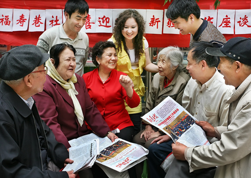 5月21日,社区各族干部群众正在热议中央新疆工作座谈会精神。当日,乌鲁木齐市天山区二道桥管委会福寿巷社区各族居民和干部欢聚在一起,热议中央新疆工作座谈会精神。居民凯比努尔·吾休尔(左四)说:“从会议精神中感受到了中央对新疆各族人民的关怀,我们对新疆的大发展充满信心。”(完)