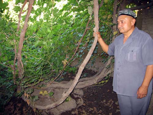 盘腿坐在葡萄乡达甫散盖村尼牙孜·热克甫家院子里的炕上,吃着香喷喷的烤馕和好几种叫不出名字的葡萄,你不由得羡慕起这种安宁富足的生活来。这是葡萄沟里的一户家访旅游点。宽敞的院子里三面都是炕,炕桌上摆满了果品小吃,院顶的木架上爬满了葡萄藤,把院子遮得严严实实,你一点也感不到外边太阳的火辣。53岁的尼牙孜·热克甫告诉记者,他家有两亩地,每年可产500公斤葡萄,收入1万元,去年投入4.5万元装修了房子和两个院子,开始搞起家访旅游来,这样去年的收入就增加到3万元,今年到8月份,收入已经达到3万元。家访旅游向游客提供饭菜、小吃,每人收费30元,每天可接待30到100人。全葡萄沟的家访点有两三百家,本村有100多家,像他家这样上规模的有15家。回想起上个世纪60年代,一年挣四五百工分,仅够吃饱肚子的生活,尼牙孜·热克甫挥了挥手,笑了起来:“还是这些年党的政策好啊!”他特别提到农村税费改革后,他家少交了100多元税费。尼牙孜·热克甫兴致勃勃地带记者去他家地里看那棵生长了500年的葡萄树,仍然是枝繁叶茂,硕果累累。他说,在葡萄沟里,像这样生长了500到800年的葡萄树还有不少。