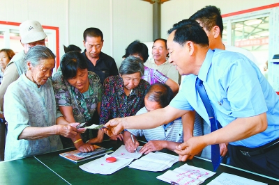 张章宝(右一)成功化解萨拉齐镇西老藏营村征地补偿纠纷,退还村民54万元征地补偿款。图为退还村民补偿款现场。(人民日报 贺勇 摄)