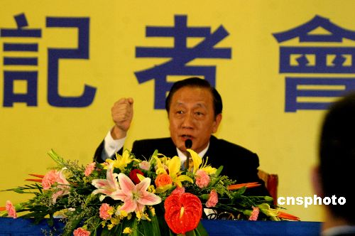 七月十二日,台湾新党纪念抗战胜利六十周年大陆访问团记者会在北京饭店举行,新党主席郁慕明在记者会上回答媒体的提问。(来源:中新网)