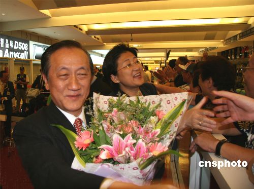 中国台湾网消息 新党主席郁慕明结束在大陆八天的“民族之旅”,七月十三日晚间十点左右抵达台北,在机场受到支持群众的欢迎。(来源:中新网;作者:路梅)