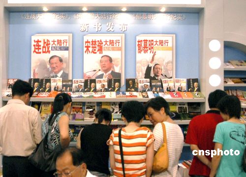 七月三十日,在厦门举行的海峡两岸图书交易会上,《连战大陆行纪实》、《宋楚瑜大陆行纪实》、《郁慕明大陆行纪实》三本新书一发布就受到市民的广泛关注。(来源:中新网;作者:王东明)