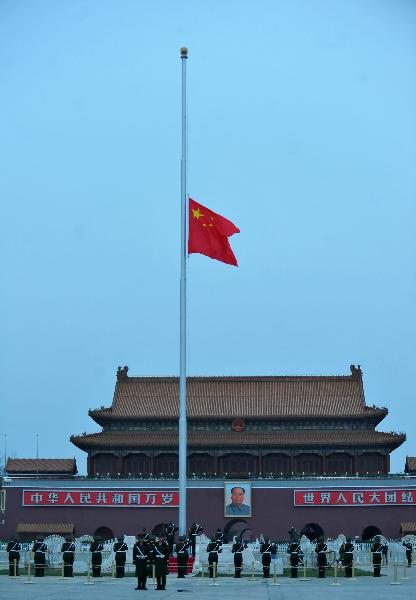 4月21日,北京天安门广场下半旗,向玉树地震遇难同胞致哀。 新华社记者罗晓光摄