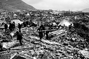 21日,玉树结古镇的灾民们正在废墟上收拾木料,为重建做准备。 记者 赵亢 摄