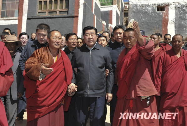 这是贾庆林在玉树县结古寺看望慰问宗教界人士。新华社记者黄敬文摄